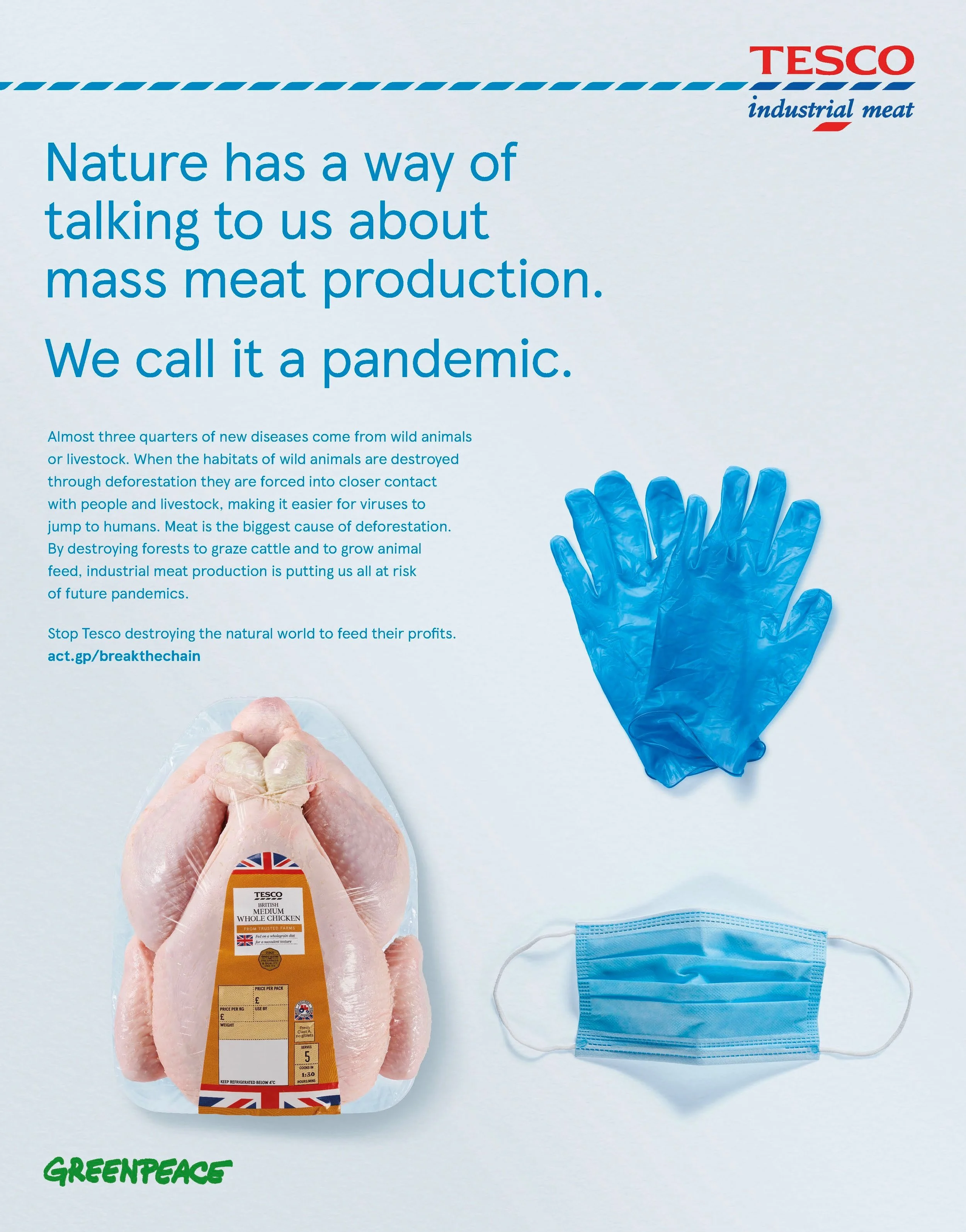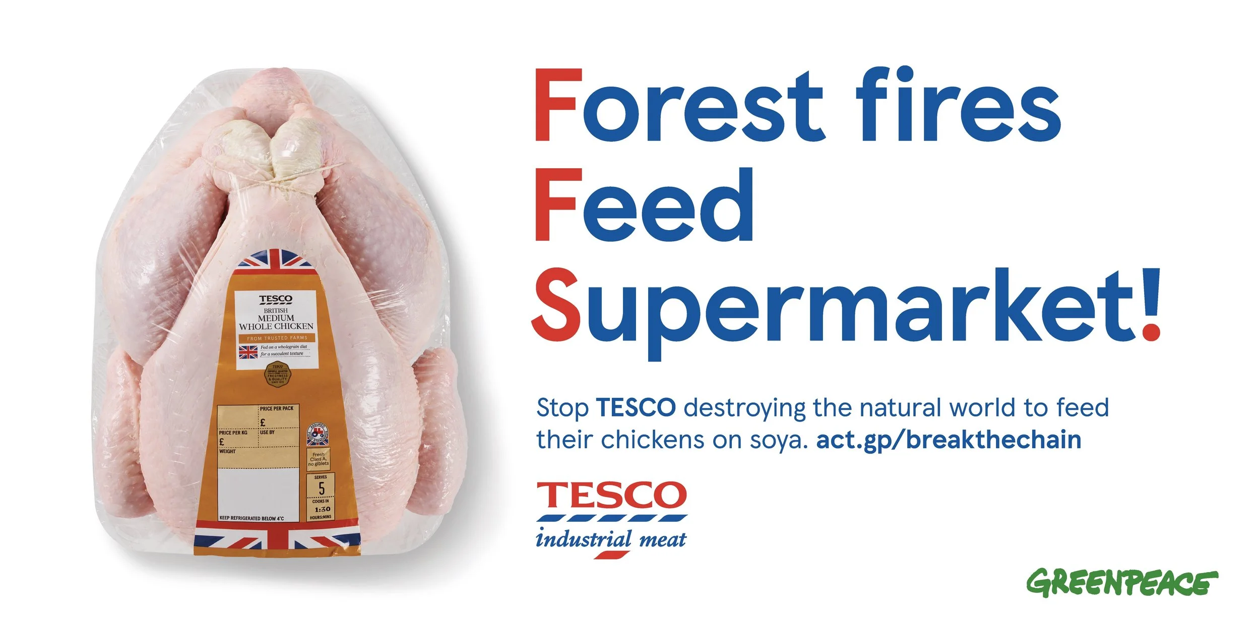 Integrated campaign devised by Mutts & Misfits with Greenpeace to save the Amazon rainforest from the threat of Industrial Meat production. The campaign consisted of a two stage approach. The first stage was an attack campaign on the supermarkets, notably Tesco, who are complicit by selling cheap meat fed on soya grown in destroyed rainforests. The second stage was a consumer online film to encourage people to eat a plant based diet.